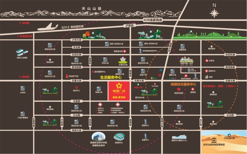 项目以运营为根本,以体验为核心,采取“六大统一”与线上线下结合的经营模式,为第十三师新星市打造首个覆盖全年龄、全场景的一站式消费聚集地。项目建成后,必将成为新星市升级版的“领先广场”,必将成为新疆东大门全新的城市地标、商业中心、生活中心、旅游中转基地、企业总部基地、电商及小微企业孵化中心。